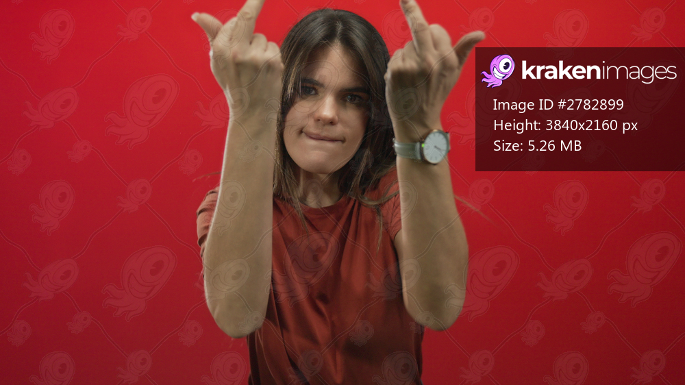 Woman making rude gestures with both middle fingers facing the camera against a vivid red background in an isolated setting.