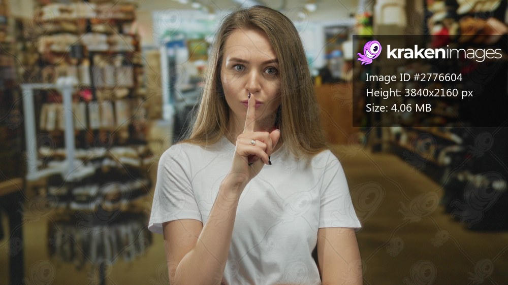 Woman making shushing gesture in casual white shirt inside retail store environment surrounded by clothing racks and indoor merchandise displays.