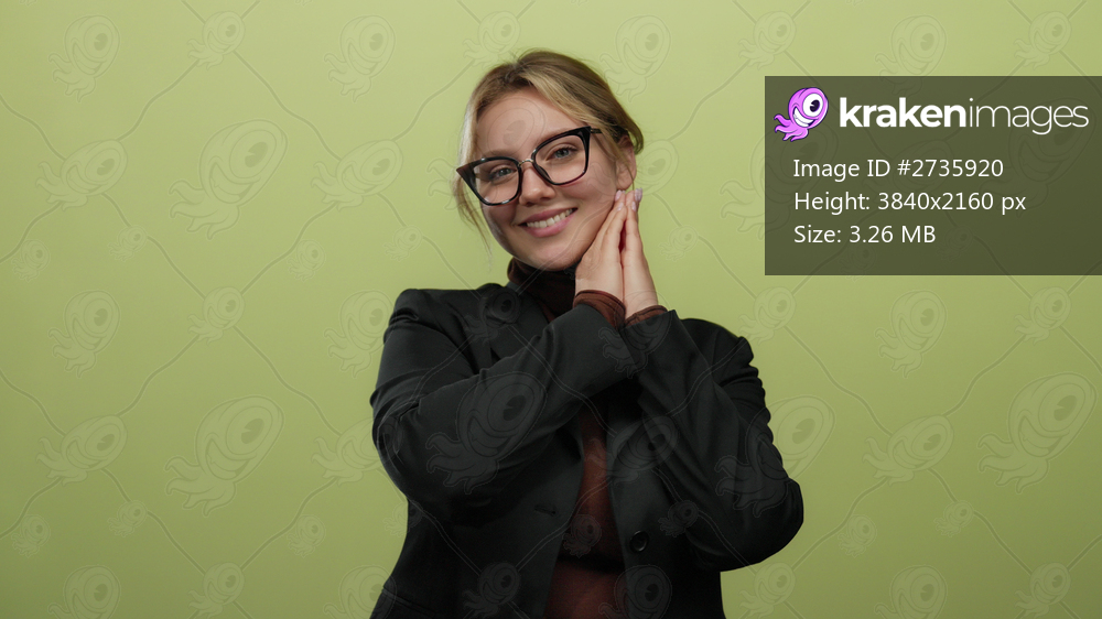 Woman making sleep gesture against a solid blue background, expressing calm and relaxation in business attire.