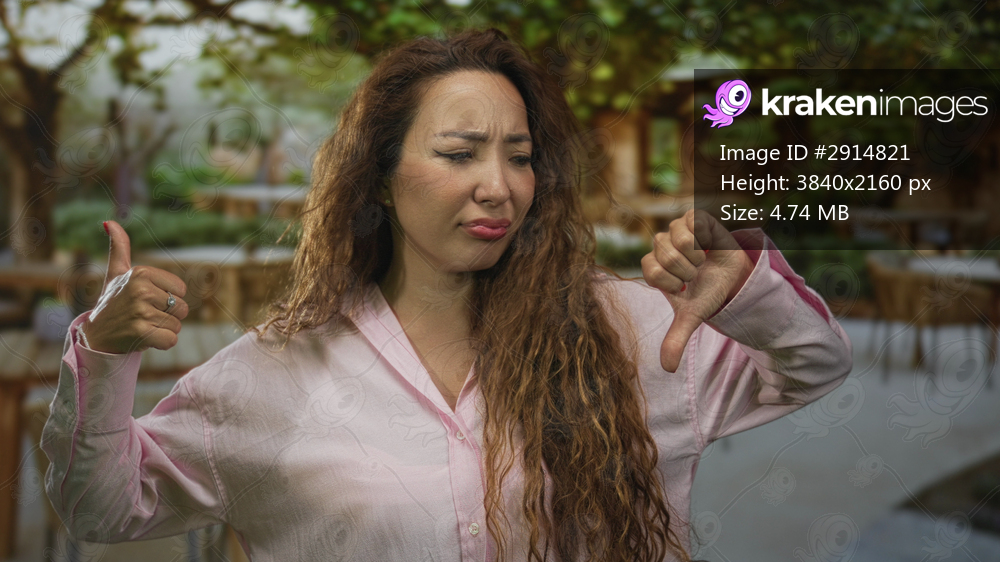 Woman making thumbs up and thumbs down gestures with both hands and a displeased grimace while wearing a pink shirt on a restaurant terrace; ambivalence. - Kraken Images