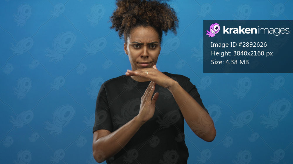 Woman making time out gesture with hands and furrowed brow, wearing black t shirt, centered against a vivid blue studio wall; frustration.
