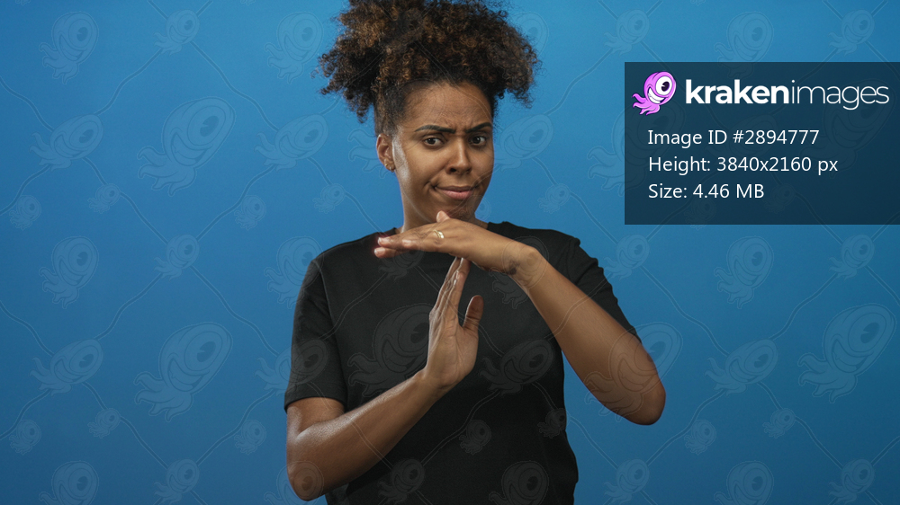 Woman making time out gesture with hands and furrowed brow, wearing black t shirt, centered against a vivid blue studio wall; frustration.