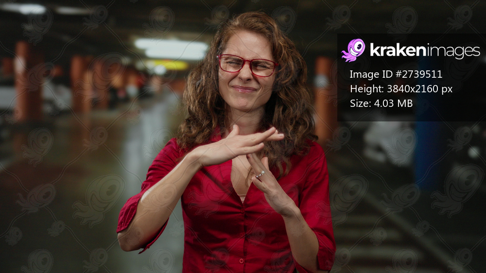 Woman making timeout gesture in indoor parking, expressing pause or break, young and smiling with curly hair and glasses.