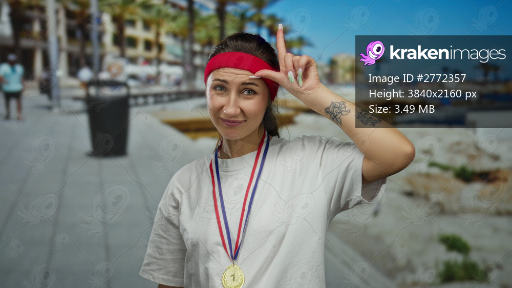 Woman with medal gesturing on promenade with beach backdrop, showcasing young athlete wearing red headband and white shirt in sunny outdoor setting with tattoo visible. - Kraken Images
