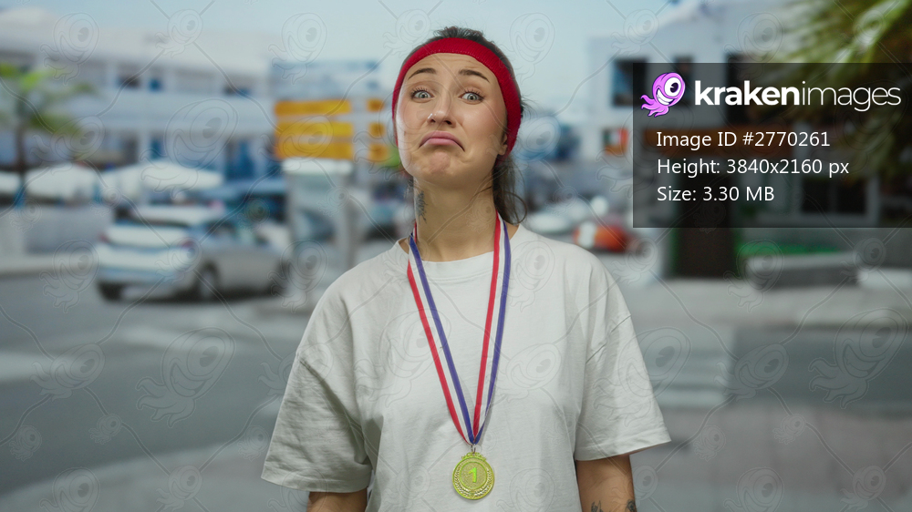 Woman with medal standing outdoors on city street with a red headband in a casual t-shirt showing funny expression on her face.