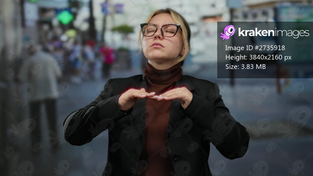 Woman meditating with a calm expression on a bustling city street adorned with blurred crowds and vibrant signs, capturing the essence of mindfulness amidst urban chaos. - Kraken Images
