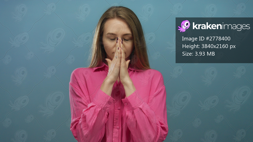 Woman meditating against isolated blue background in vibrant pink shirt showcasing tranquility and mindfulness.
