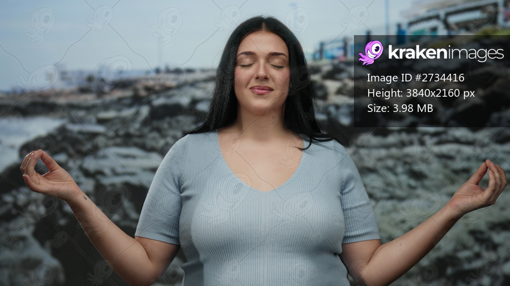 Woman meditating at seaside with closed eyes, enjoying serene beach environment under clear sky, exuding calm and relaxation, focusing on inner peace and mindfulness. - Kraken Images