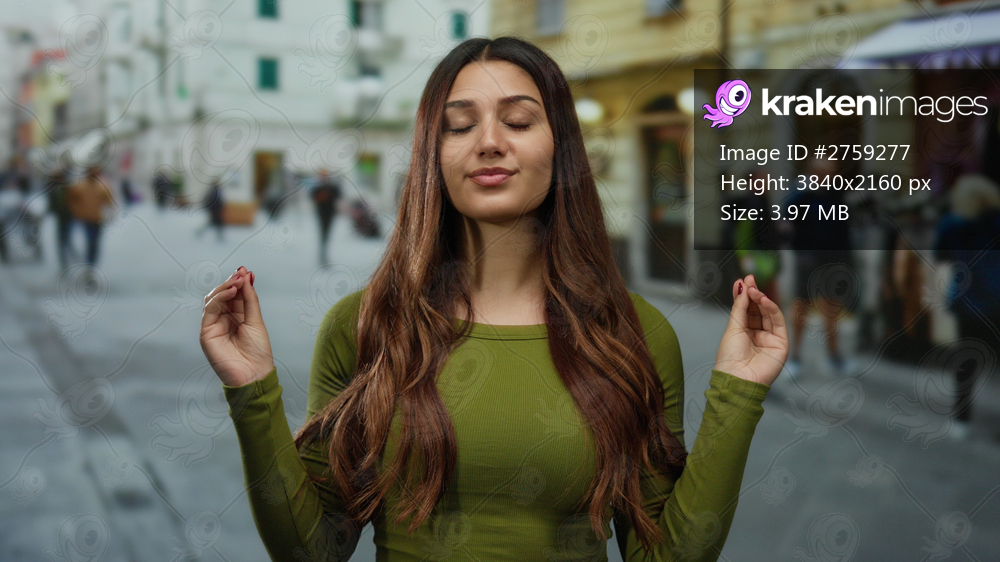 Woman meditating with closed eyes on a bustling street, exuding calmness and relaxation amid the urban scenery, showcasing serenity and mindfulness in a vibrant city environment. - Kraken Images
