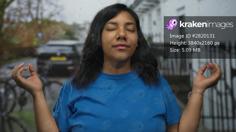 Woman meditating with closed eyes wearing blue shirt and fingertips touching mudra gesture on street; calm mindfulness.