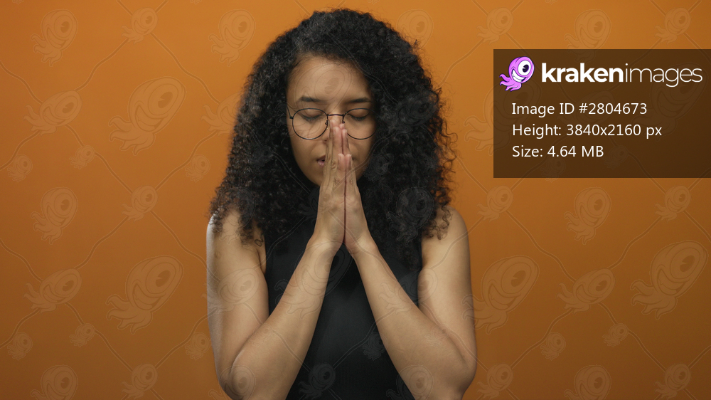 Woman meditating with eyes closed against an orange background, conveying a sense of calm and focus with her hands pressed together in prayer position. - Kraken Images