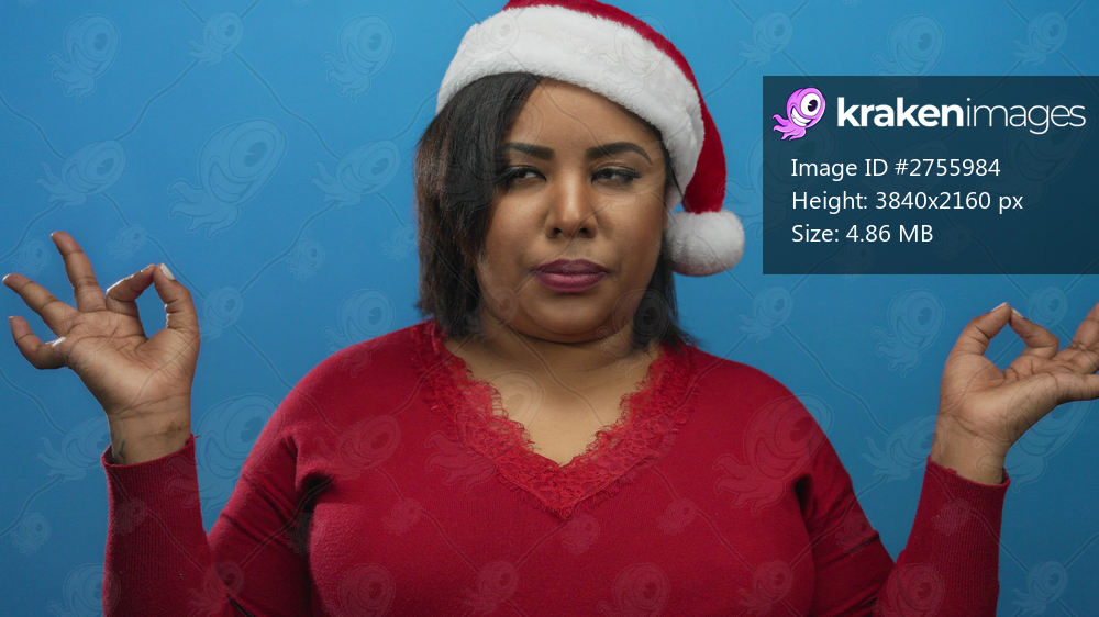 Woman meditating with eyes closed in a santa hat and red shirt against a blue background celebrating christmas in a peaceful, festive atmosphere.