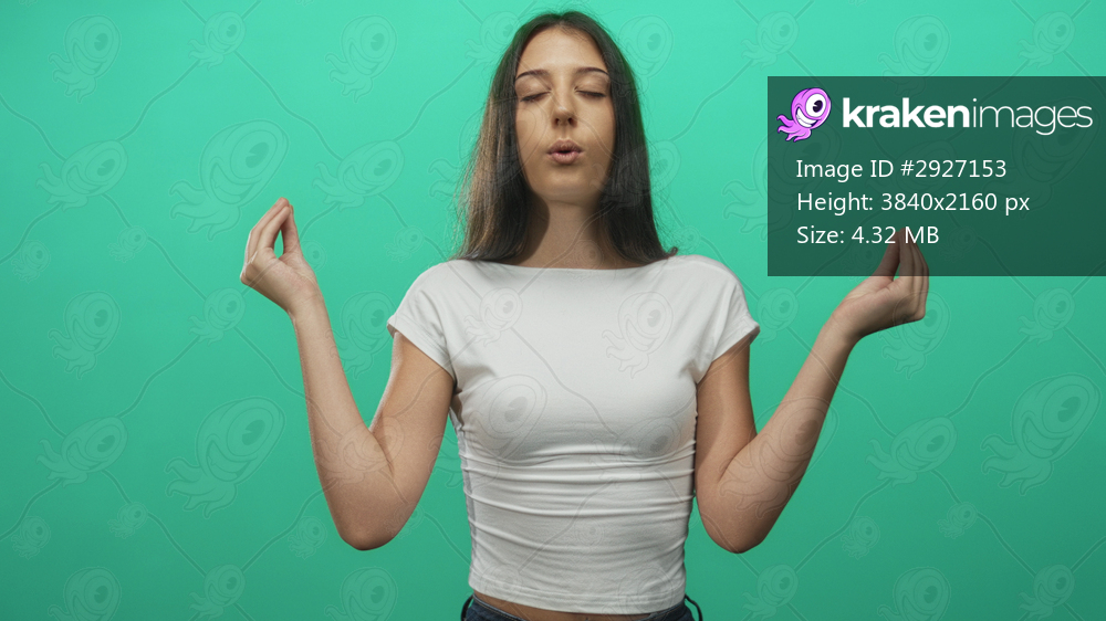 Woman meditating with hands in mudra and exposed navel piercing in studio with green wall and closed eyes; serenity.