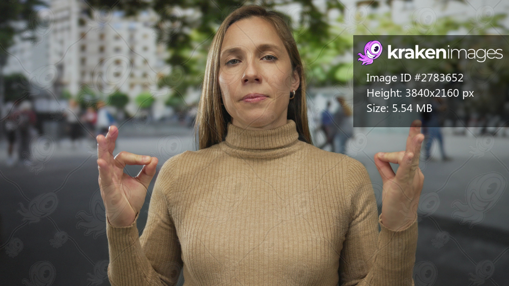 Woman meditating in an urban setting, practicing mindfulness with eyes closed and hands in a mudra gesture, while standing outdoors on a city street.