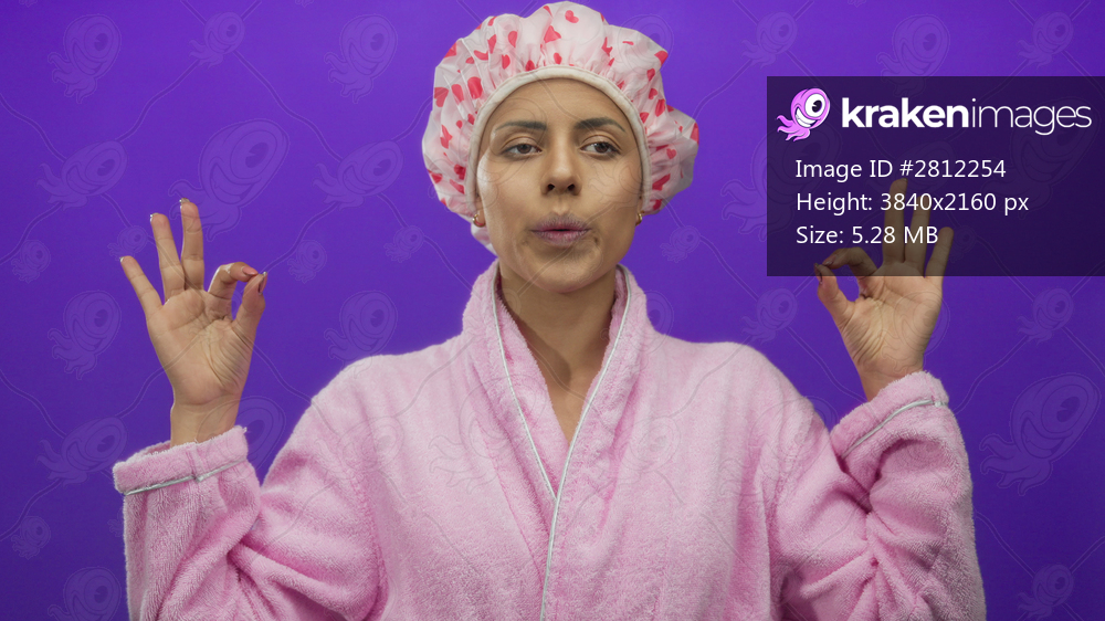 Woman meditating in pink bathrobe and shower cap against a purple background with hands in yoga gesture.