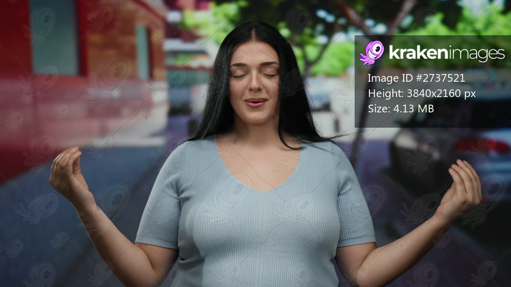 Woman meditating outdoors in a city street poses peacefully wearing casual attire with hands together, embracing tranquility surrounded by urban trees, cars, and buildings. - Kraken Images