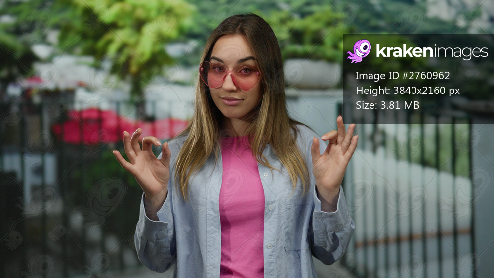 Woman meditating outdoors in street setting, wearing pink sunglasses and casual attire, embodying calm and relaxation amidst a vibrant and lush background. - Kraken Images