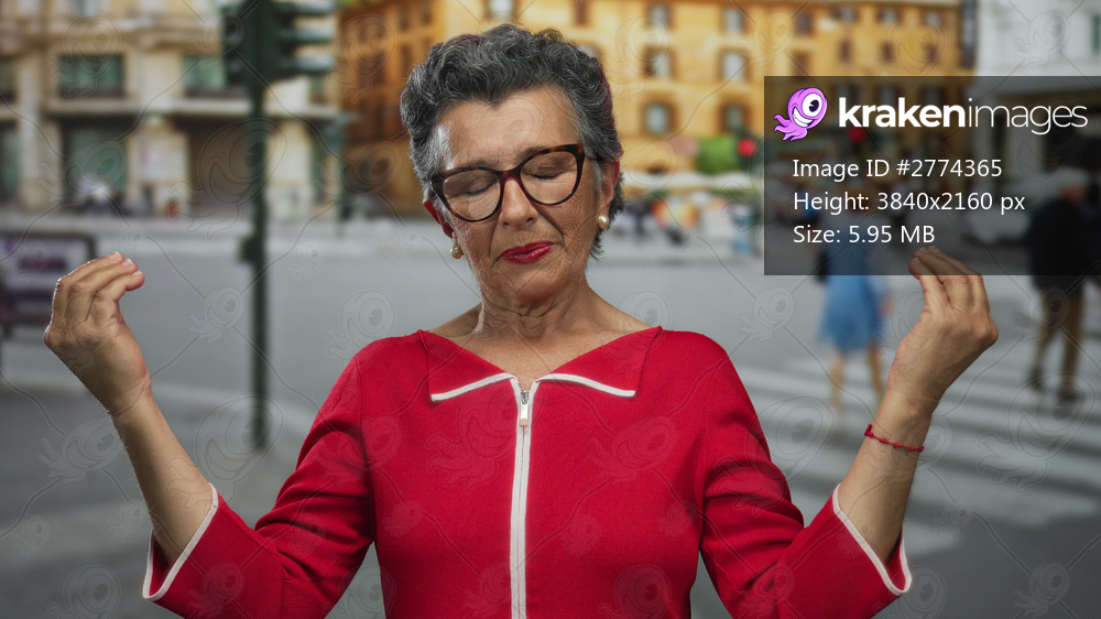 Woman meditating peacefully on a busy urban street with blurred pedestrians in the background, showcasing tranquility amidst city life with an older woman in focus. - Kraken Images