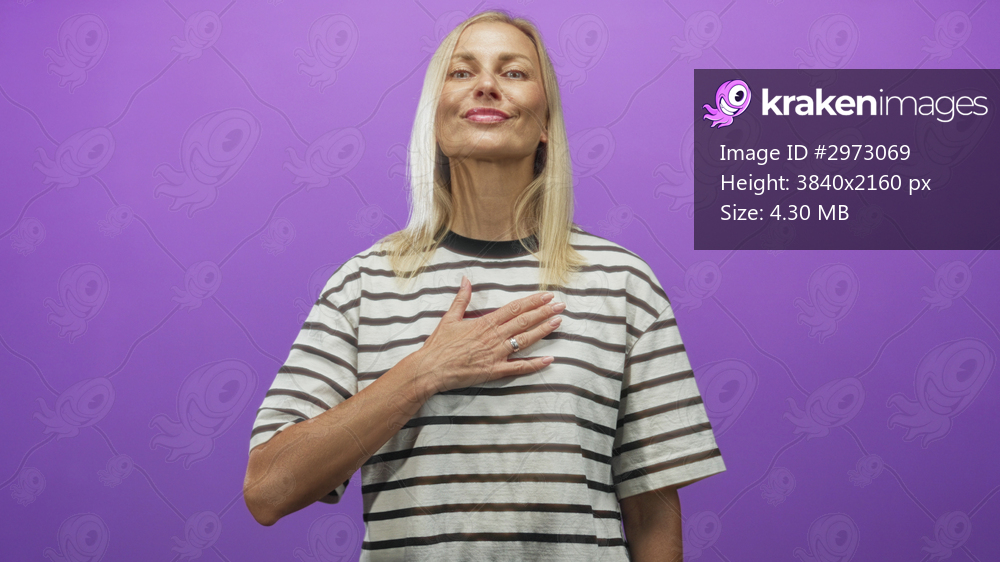 Woman middle age blonde in striped shirt with hand on chest smiling gently against purple studio backdrop; quiet gratitude.
