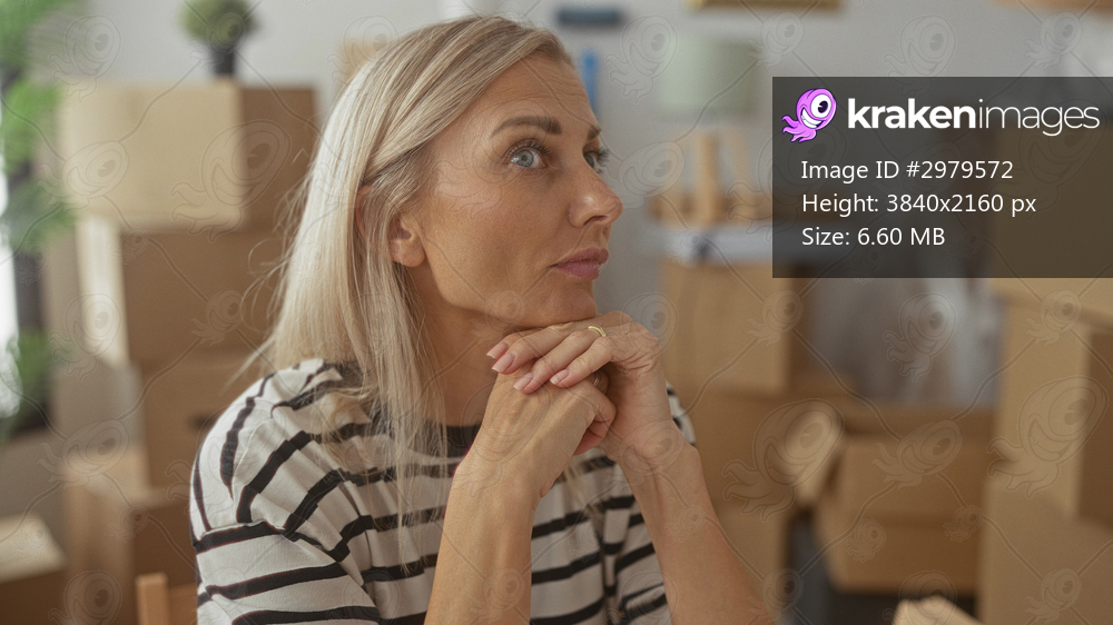 Woman middle age blonde rests chin on clasped hands among stacked cardboard boxes in a residential building; quiet contemplation.