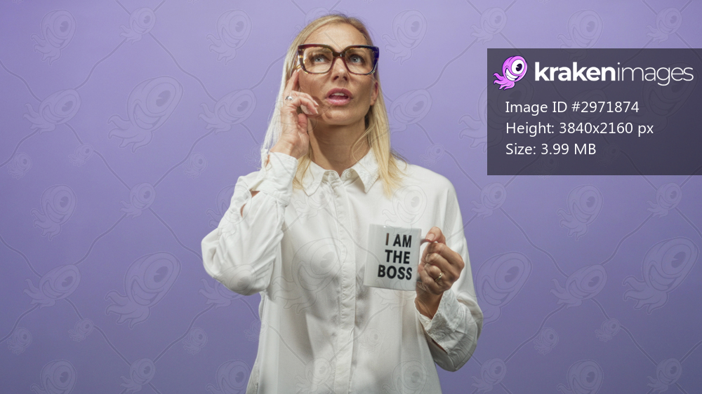 Woman middle age blonde wearing glasses and white shirt holding i am the boss mug, touching cheek with finger against purple studio backdrop; confidence. - Kraken Images