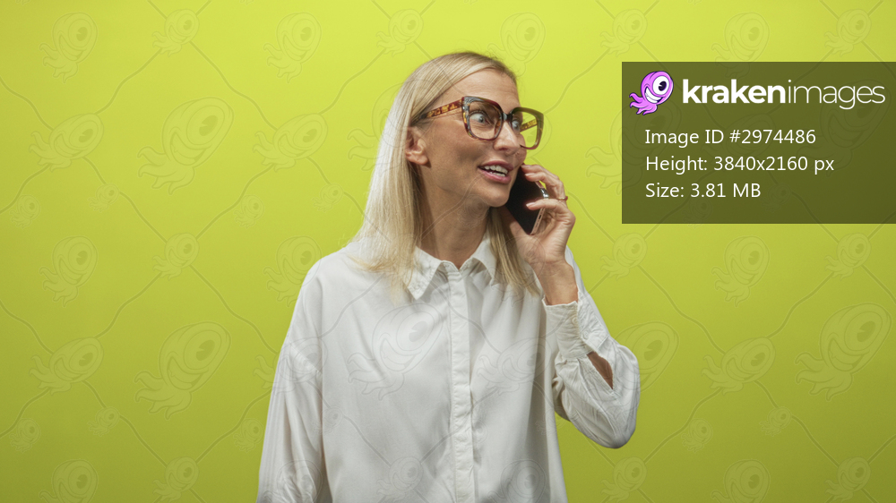 Woman middle age blonde wearing glasses and white shirt holding smartphone to ear with surprised open mouth in studio; surprise curiosity.