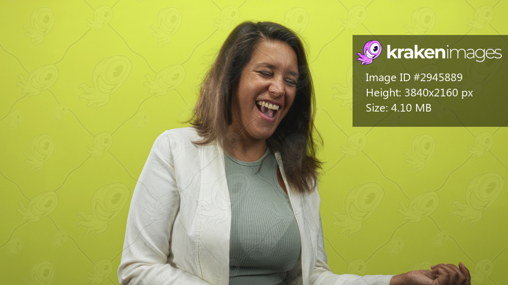 Woman middle age brunette headbanging and miming air guitar with clenched hand and laughing against lime green studio wall; joy.
