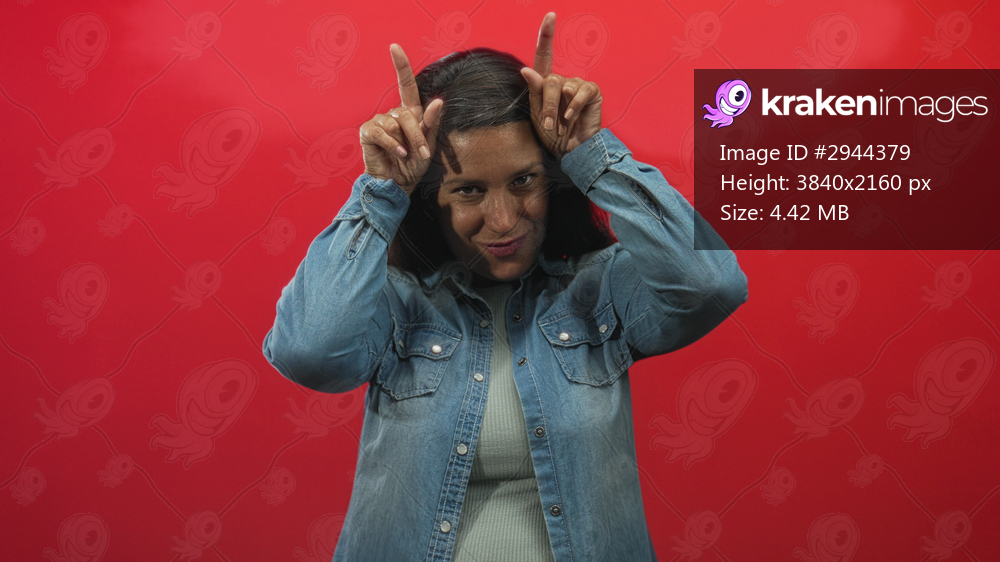 Woman middle age brunette posing with fingers as horns and smiling against a bright red studio backdrop; playful mischief.