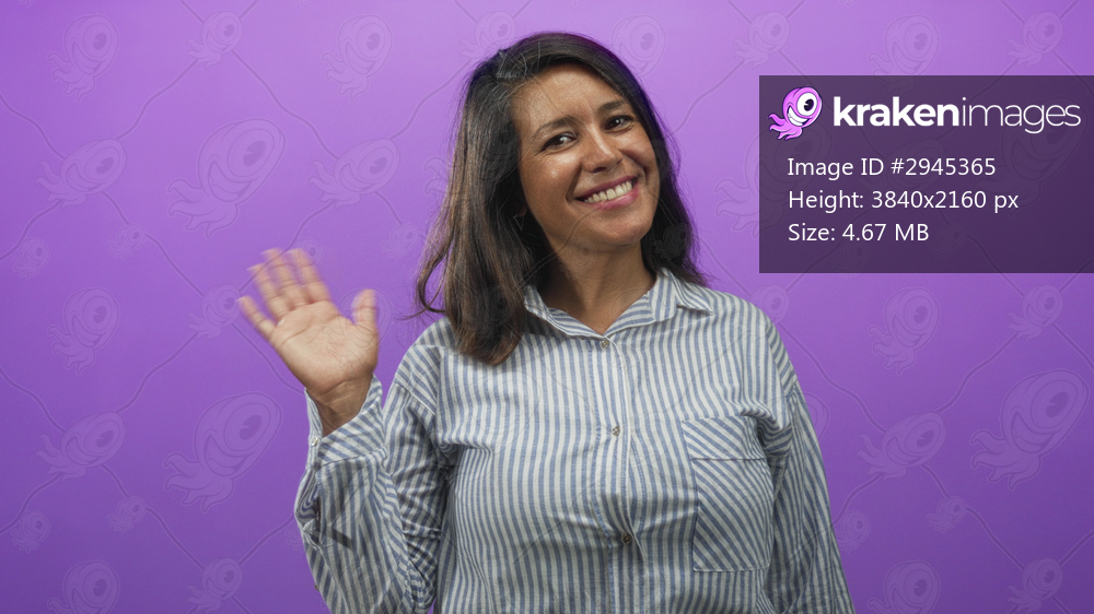 Woman middle age brunette waving palm and smiling toward camera in studio with purple backdrop, wearing striped shirt; friendly greeting.