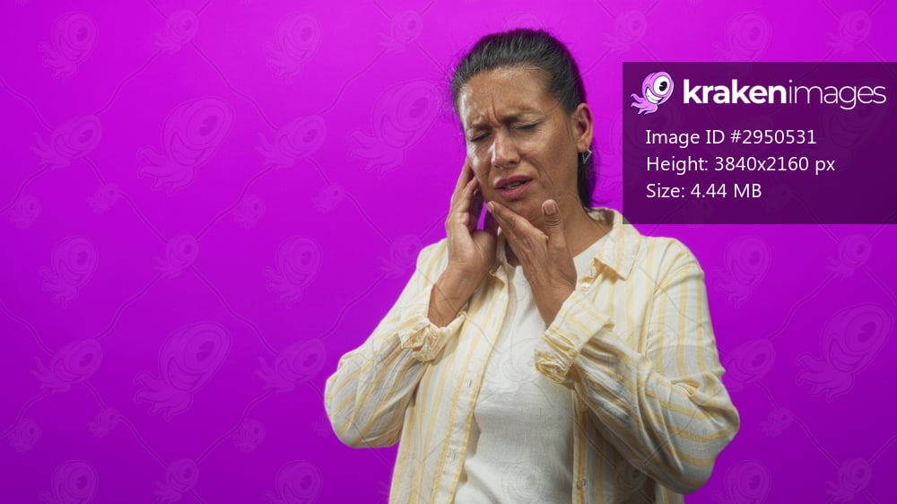 Woman middle age brunette wearing a striped shirt holding her cheek with one hand and wincing against a purple studio backdrop; toothache pain.