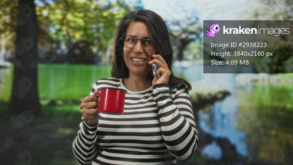 Woman middle age brunette wearing glasses and striped sweater, holding a red mug and talking on a mobile phone in a forest setting, smiling; serenity connection. - Kraken Images