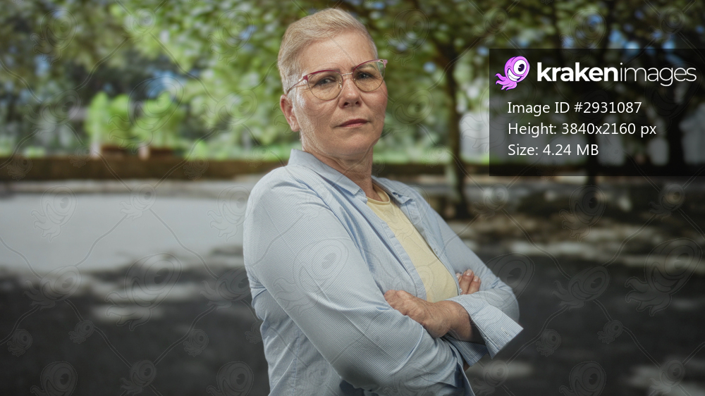 Woman middle age caucasian with arms crossed and eyeglasses standing in forest park near shaded pathway beneath green trees; confidence resilience.