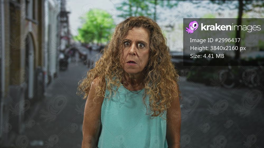 Woman middle age with curly hair and bare forearm visible, staring straight ahead on a city street near bicycles and storefronts; confusion.