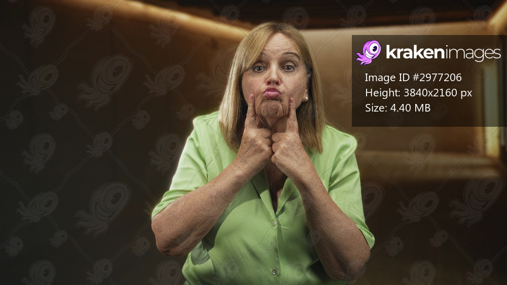 Woman middle age hispanic blonde presses cheeks with fingers and puckers lips while facing camera in a lit studio corridor set wearing a green blouse; playful defiance. - Kraken Images