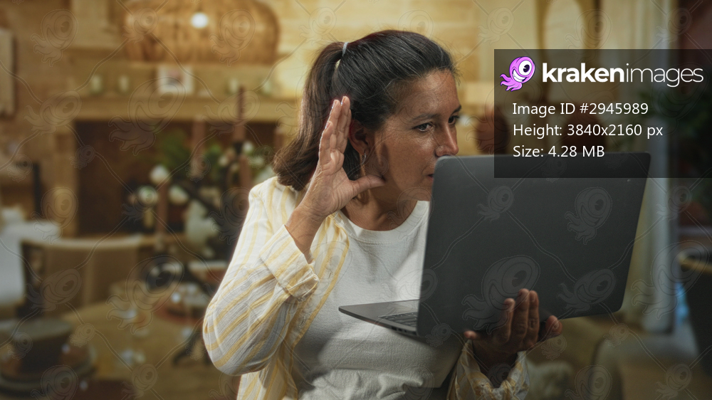 Woman middle age hispanic brunette holding laptop, hand cupped to ear leaning into screen to listen in a cozy living room inside a building; curiosity. - Kraken Images