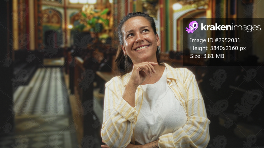 Woman middle age hispanic brunette in striped shirt tucks hair behind ear and smiles while standing in ornate church building; serenity reflection.