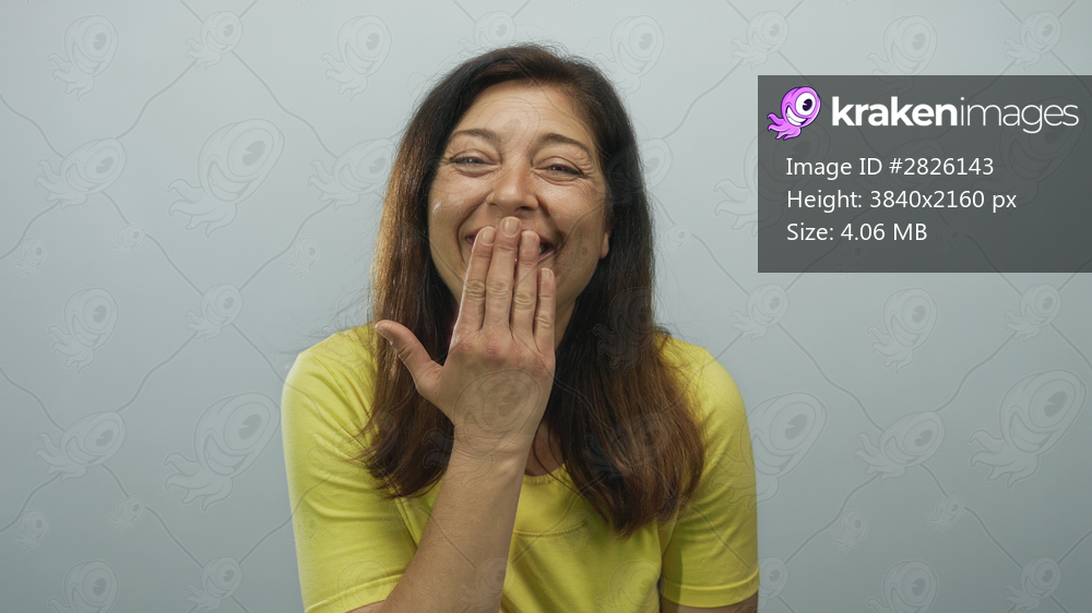 Woman middle age hispanic covering mouth while laughing in studio with light blue background; happiness.