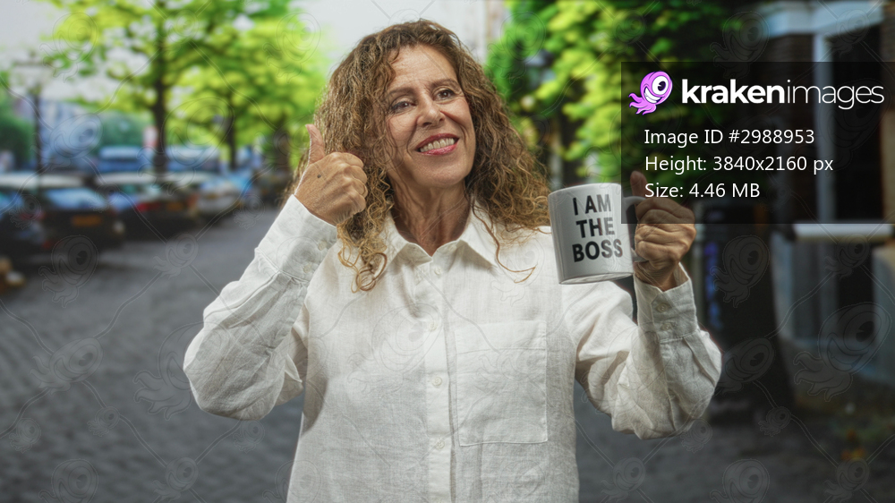 Woman middle age hispanic holds a mug reading i am the boss and gives thumbs up on a street in a white shirt; confidence.