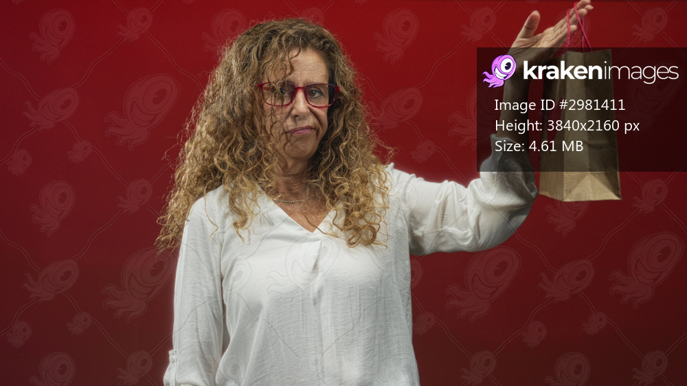 Woman middle age holding a paper gift bag with heart in hand and raising the other hand in studio; disappointment contemplation.