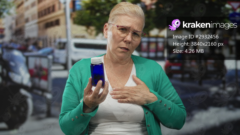 Woman middle age holding blue medicine bottle and clutching chest for heartattack on crowded urban street with cars and blurred storefronts behind her; health concern. - Kraken Images
