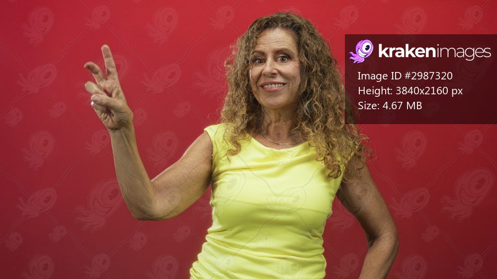 Woman middle age in yellow tanktop holds two fingers up for peace in studio red backdrop and curly hair; confidence optimism.