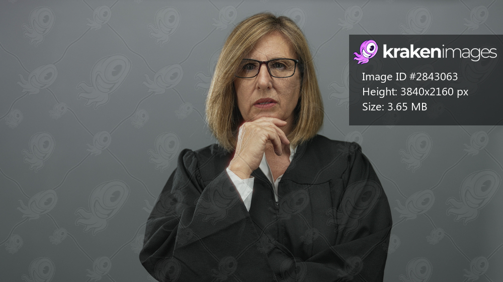 Woman middle age judge with pensive hand on chin in grey studio wearing glasses and black robe; contemplation.