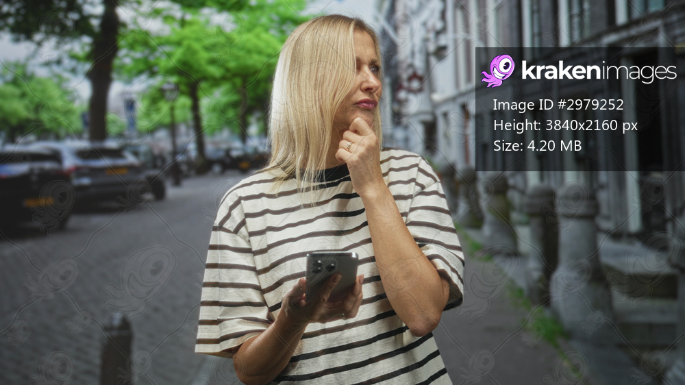 Woman middle aged blonde holding smartphone and touching chin while glancing at screen in street with stone bollards and parked cars visible; pensive thought. - Kraken Images