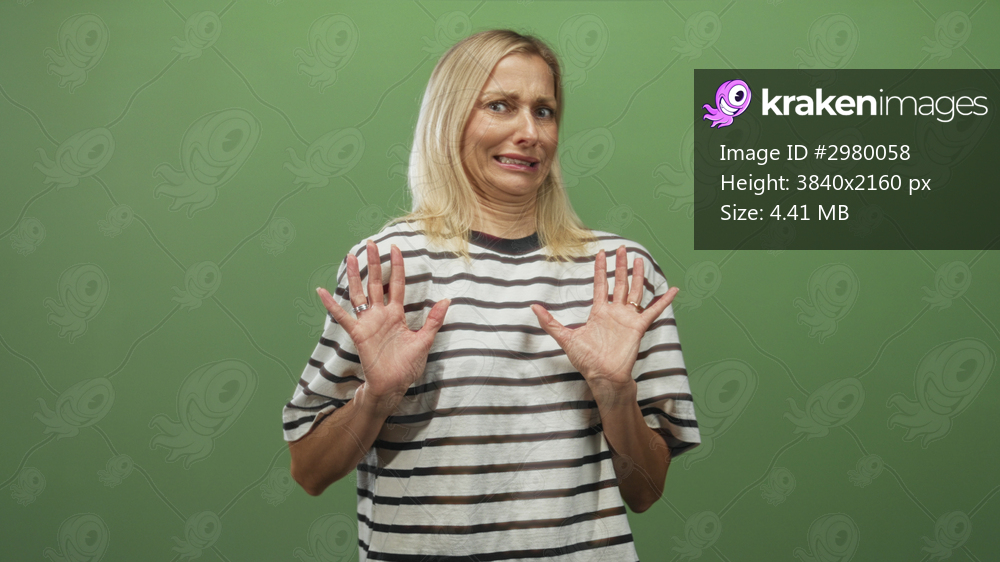 Woman middle aged blonde in striped tshirt, palms raised and fingers splayed with a grimace against a green studio backdrop; disgust reluctance.