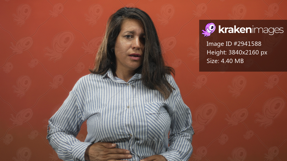 Woman middle aged brunette in striped shirt with hand on lower stomach and pained expression in studio with red wall; pain concern.