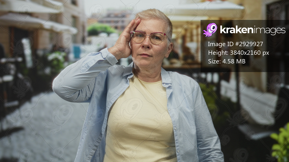 Woman middle aged clutching temple for headache, wearing glasses and casual shirt at a restaurant terrace on a street with cafe tables and umbrellas; discomfort. - Kraken Images