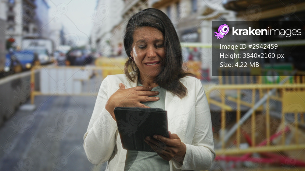Woman middle aged hispanic brunette holding tablet, hand on chest gesture while reading messages on a busy street with construction barriers and blurred traffic; relief gratitude. - Kraken Images