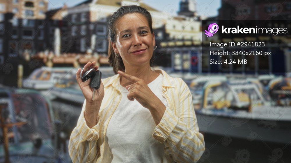 Woman middle aged hispanic brunette points to car keys while holding them up in a studio with city mural and parked cars behind her; confidence ownership. - Kraken Images