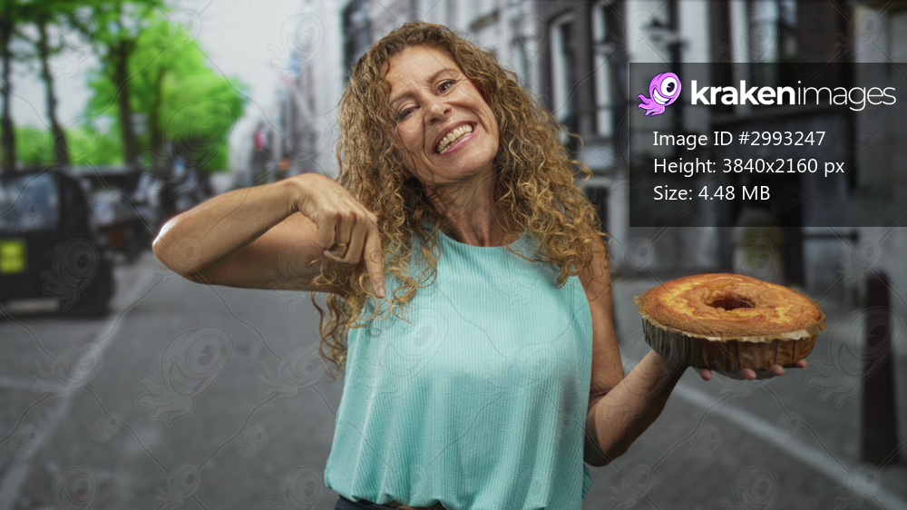 Woman middle aged hispanic points finger to sponge cake held in hand on a city street with bakery storefront, cobblestones and parked cars visible; cheerful offering. - Kraken Images