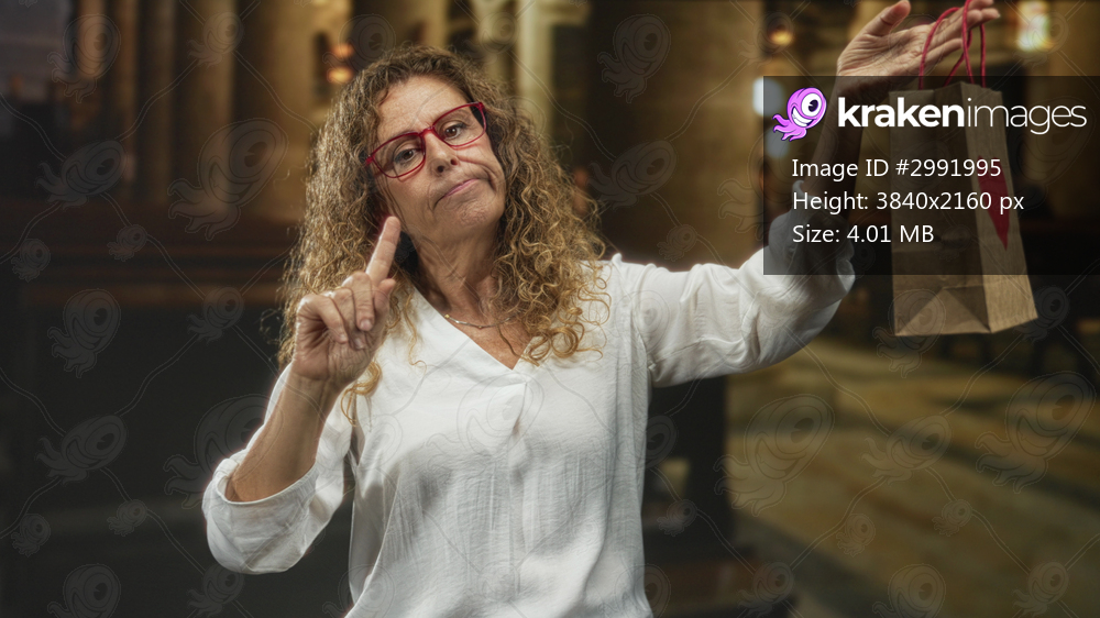 Woman middle aged hispanic wearing red glasses holding a brown paper gift bag with a red heart and showing thumb down gesture in a church; disapproval refusal. - Kraken Images